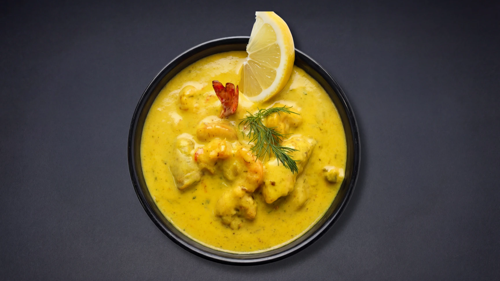 شوربة روبيان مطبوخة مع بهارات الكاري لتقديم نكهة دافئة ومميزة.