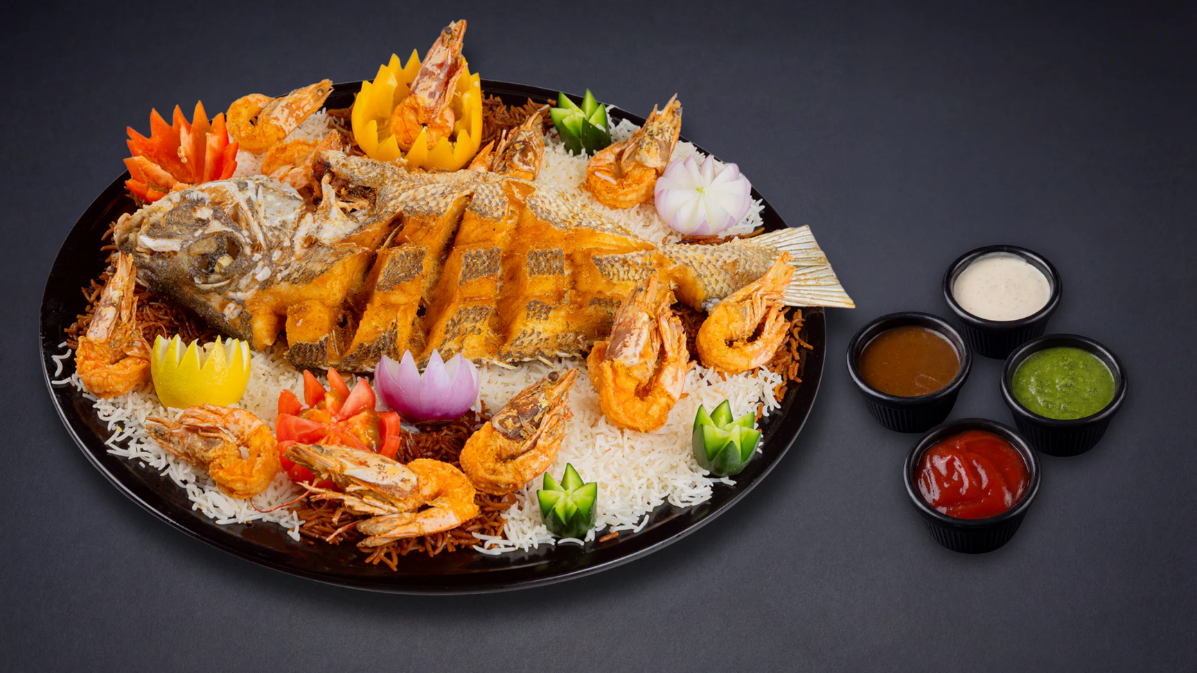 وجبة تحتوي على 1 كيلو قمر مقلي و 250 جرام روبيان، تقدم مع نفر أرز مشكل.