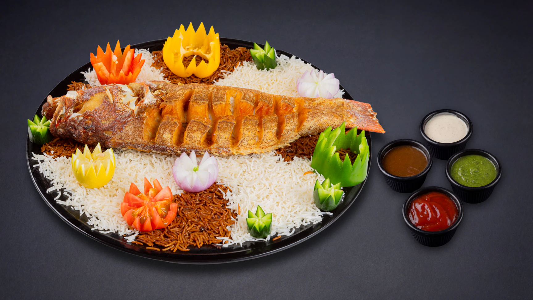 وجبة تحتوي على 1 كيلو ناجل مقلي، تقدم مع نفر أرز مشكل.