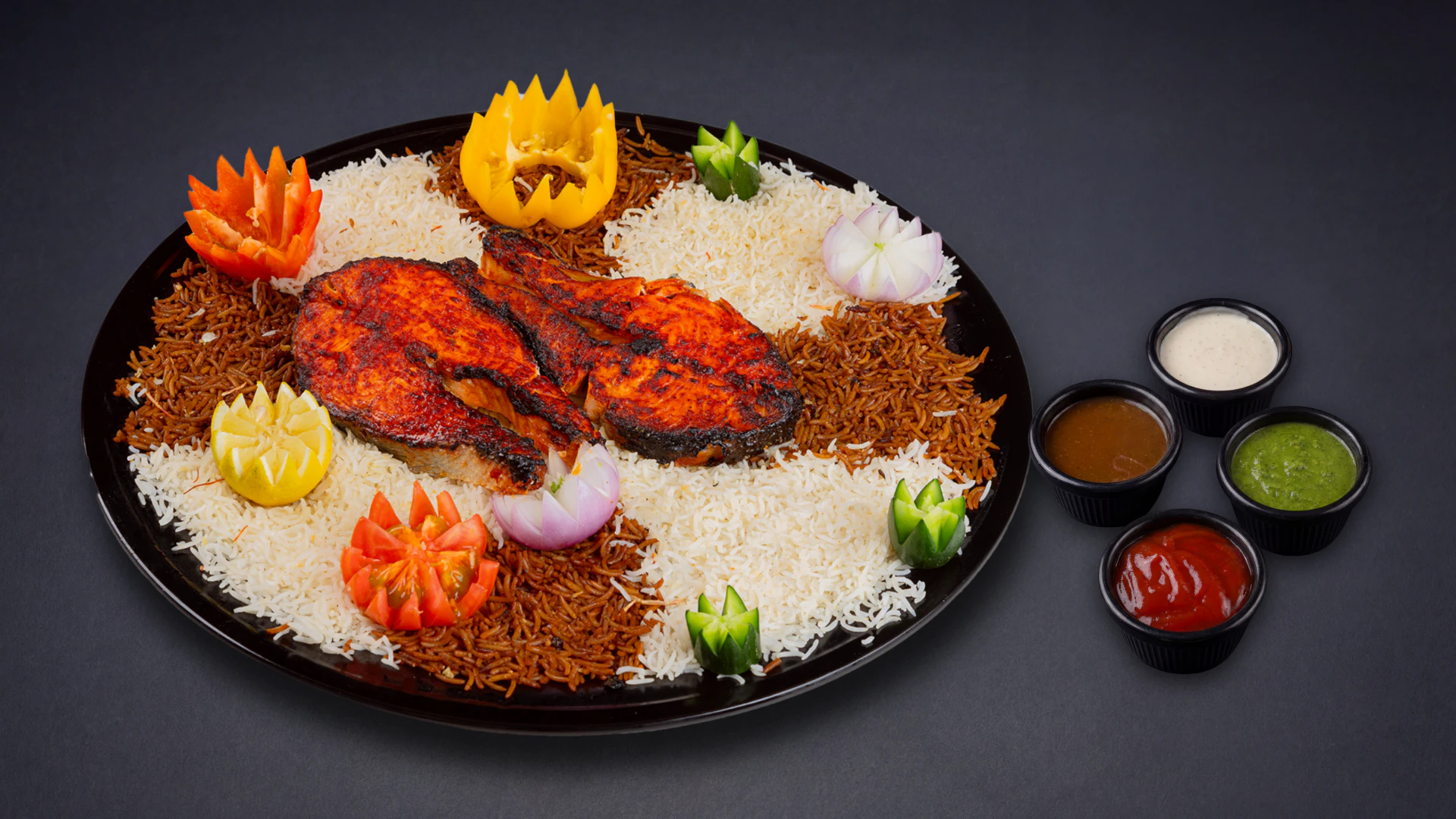 وجبة تحتوي على نصف كيلو سلمون مقلي، تقدم مع نفر أرز مشكل.